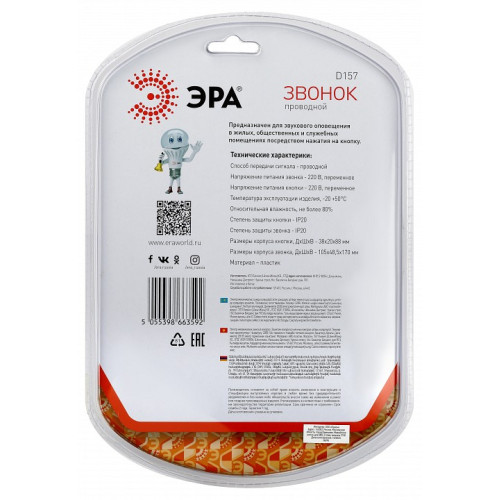 Цвет арматуры - белый. Запись типов - Сопутствующие товары,Звонки проводные. Компоненты, входящие в комплект - сетевой шнур длиной 1,5 м.. Поверхность арматуры - матовый. Степень пылевлагозащиты, IP - 20. Диапазон рабочих температур - -45-[+40]. Основной цвет - разноцветная. Место размещения - Бра и настенные светильники. Гарантия, месяцы - 12. Дополнительные параметры - 1 мелодия. Размер упаковки, мм - 310x210x55. Масса брутто, кг - 0.57. Объем упаковки, куб. м - 0.0040095. Свет - Да. Характеристики товара: Артикул товара: D157 Штрихкод:
