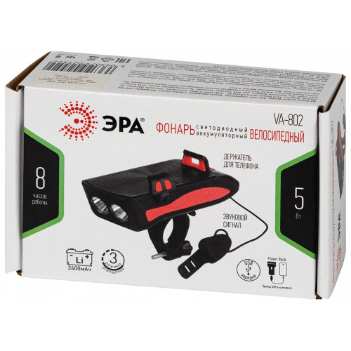 Тип лампы - светодиодная [LED]. Цвет арматуры - черный. Материал арматуры - полимер, резина. Площадь освещения, м2 - 2.5. Количество плафонов - 1. Направление плафонов - вперед. Максимальная мощность лампы, Вт - 5. Запись типов - Специальные светильники,Уличные светильники,Фонари велосипедные. Компоненты, входящие в комплект - Li аккумулятор 2400 мАч (время зарядки 3 часа). Общее кол-во ламп - 1. Лампы в комплекте - светодиодная [LED]. Цвет плафонов и подвесок - черный. Поверхность плафонов и подвесок - матовый. Поверхность арматуры - матовый. Материал плафонов и подвесок - полимер, резина. Степень пылевлагозащиты, IP - 40. Форма плафонов - сложная. Диапазон рабочих температур - +1-[+35]. Основной цвет - разноцветная. Помещение - Улица. Гарантия, месяцы - 12. Сопоставление с лампой накаливания - на 60 % больше. Тип лампы основной - светодиодная [LED]. Основное помещение - Улица. Штрих-код - 5063079025522. Дополнительные параметры - дальность луча - 85 м.. Размер упаковки, мм - 180x115x65. Масса брутто, кг - 0.28. Объем упаковки, куб. м - 0.0013455. Наличие выключателя, диммера или пульта ДУ - выключатель. Мощность, приведенная к лампе накаливания, Вт - 8. Свет - Да. Характеристики товара: Артикул товара: VA-802 Штрихкод: 5063079025522