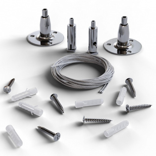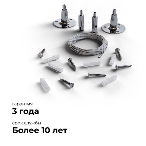 Компоненты, входящие в комплект | потолочное крепление-2шт, цанговый зажим-2шт, трос-2шт, дюбель-3шт, самонарезающий винт-3шт |