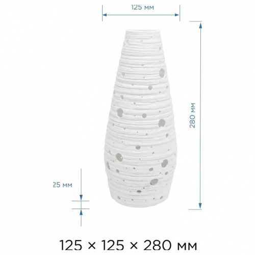 Стиль - модерн. Тип лампы - светодиодная [LED]. Цвет арматуры - белый. Материал арматуры - керамика. Площадь освещения, м2 - 12.5. Количество плафонов - 1. Направление плафонов - в стороны. Максимальная мощность лампы, Вт - 25. Запись типов - Светильники,Настольные лампы декоративные. Высота, мм - 280. Размеры, мм - 125x280. Компоненты, входящие в комплект - провод электропитания с вилкой без заземления. Общее кол-во ламп - 1. Лампы в комплекте - отсутствуют. Цвет плафонов и подвесок - белый. Поверхность плафонов и подвесок - матовый. Поверхность арматуры - матовый. Материал плафонов и подвесок - керамика. Класс электробезопасности - II. Степень пылевлагозащиты, IP - 20. Напряжение питания лампы, В - 220. Форма плафонов - конус круглый. Диапазон рабочих температур - +5-[+30]. Основной цвет - разноцветная. Место размещения - Настольные лампы. Помещение - Гостиная,Кабинет,Спальня. Гарантия, месяцы - 12. Тип лампы основной - светодиодная [LED]. Основное помещение - Гостиная. Штрих-код - 4650089056380. Диаметр, мм - 125. Размер упаковки, мм - 285x130x130. Масса брутто, кг - 0.87. Тип цоколя лампы - E14. Объем упаковки, куб. м - 0.004901. Способ крепления к поверхности - на задней крышке. Тип цоколя лампы основной - E14. Высота (мин), мм - 280. Наличие выключателя, диммера или пульта ДУ - выключатель на проводе. Свет - Да. Характеристики товара: Артикул товара: 12-079 Штрихкод: 4650089056380