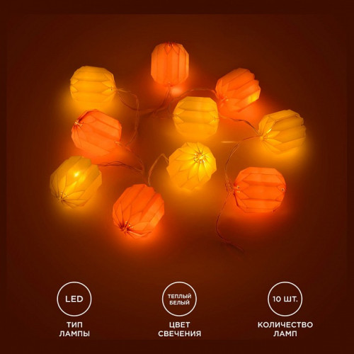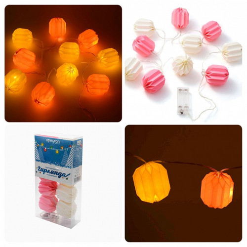Запись типов - Светильники,Гирлянды с насадками. Длина, мм - 1500. Общее кол-во ламп - 10. Цвет плафонов и подвесок - белый, розовый. Степень пылевлагозащиты, IP - 20. Форма плафонов - бумажные фонарики. Основной цвет - разноцветная. Гарантия, месяцы - 12. Цвет лампы - белый теплый. Штрих-код - 4650089052801. Размер упаковки, мм - 1650x60x280. Масса брутто, кг - 0.06. Объем упаковки, куб. м - 0.02772. Ресурс лампы - 3 тыс. часов. Необходимые компоненты - 2 батарейки АА. Цвет провода - прозрачный. Свет - Да. Характеристики товара: Артикул товара: 15-20 Штрихкод: 4650089052801