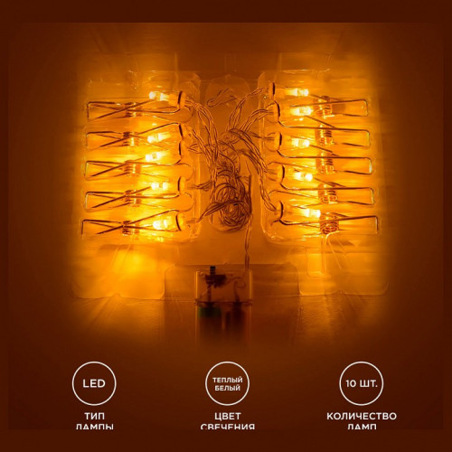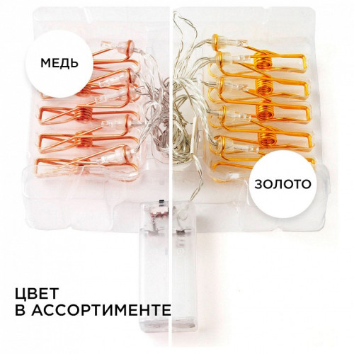 Запись типов - Светильники,Гирлянды с насадками. Длина, мм - 2000. Общее кол-во ламп - 10. Цвет плафонов и подвесок - золото ,медь. Степень пылевлагозащиты, IP - 20. Форма плафонов - прищепка. Основной цвет - разноцветная. Гарантия, месяцы - 12. Цвет лампы - белый теплый. Штрих-код - 4650089058780. Размер упаковки, мм - 190x147x48. Масса брутто, кг - 0.23. Объем упаковки, куб. м - 0.00134064. Ресурс лампы - 3 тыс. часов. Необходимые компоненты - 2 батарейки АА. Цвет провода - прозрачный. Свет - Да. Характеристики товара: Артикул товара: 15-59 Штрихкод: 4650089058780