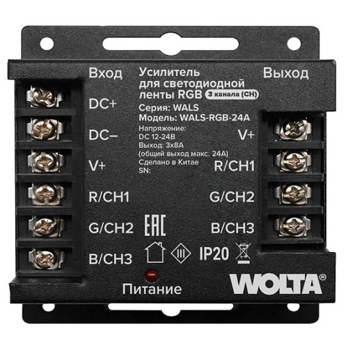 Цвет арматуры - черный. Запись типов - Комплектующие для светильников,Комплектующие для лент светодиодных,Усилители. Длина, мм - 80. Ширина, мм - 73. Высота, мм - 33. Размеры, мм - 80x73x33. Поверхность арматуры - матовый. Класс электробезопасности - III. Напряжение питания, В - 12-24. Степень пылевлагозащиты, IP - 20. Диапазон рабочих температур - +1-[+45]. Основной цвет - разноцветная. Гарантия, месяцы - 36. Штрих-код - 4680614752296. Дополнительные параметры - 3-канальный. Размер упаковки, мм - 120x40x29. Объем упаковки, куб. м - 0.000139. Номинальный ток, A - 24. Напряжение на нагрузке, В - 12-24. Новинка - Да. Свет - Да. Характеристики товара: Артикул товара: WALS-RGB-24A Штрихкод: 4680614752296