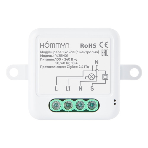 Комплектация: реле, руководство пользователя – 3шт.Умное реле – это надежное устройство, предназначенное для созданияумного домашнего окружения. Одноканальное умное реле позволяет«прокачать» ваш любимый домашний «неумный» одноклавишный выключатель илирозетку, делая их умными, не меняя их оригинальные функции и внешнийвид. Компактный размер реле позволяет провести его монтаж в стандартныйкруглый подрозетник, спрятав его в стене за выключателем. Дляподключения требуется питающая линия L (фаза) и нулевая линия N(нейтраль). Умное реле добавляет возможность удаленного управленияосвещением и розетками через приложение или с помощью голосовыхпомощников Алиса, Салют, Маруся. Реле поддерживаетпередачу данных по беспроводному протоколу Zigbee 3.0. Реле Hommynработает с приложениями умного дома: Hommyn,Tuya Smart life, Home Assistant, Дом с Алисой,Салют умный дом. Для подключения к приложению требуетсяzigbee хаб. Для подключения к приложению Hommyn требуется оригинальныйzigbee хаб HOMMYN Hub HH-01. Выбирая реле Hommyn, вы получаетекачественное и надежное устройство, которое повысит уровень вашегокомфорта и безопасности.Основные функциивключает и выключает подключенный к реле выключатель или розеткучерез приложение или с помощью голосовых помощников Алиса, Маруся,Салют;поддерживает автоматическое управление по расписанию черезприложение;поддерживает механические, звонковые, проходныевыключатели;для подключения к электроцепи требуется нулевая линия N(нейтраль) и питающая линия L (фаза);является ретранслятором и усилителем сигнала zigbee 3.0;реле на 1 канал управляет 1 группой нагрузки (например, 1лампочка);имеет защиту от скачков напряжения;поддерживает сценарии автоматизации с другими датчиками иприборами в приложениях Tuya Smart life, HomeAssistant, Дом с Алисой и Салют умныйдом.Установка и настройкаКомпактные размеры реле позволяют провести монтаж в стандартнуюкруглую монтажную коробку в стене и спрятать его за обычный «неумный»выключатель или розетку. Монтаж и подключение производится всоответствии с руководством пользователя, прилагаемым к продукту.Требуется нулевая линия N.Основные технические характеристики:Модель: 3RLZBN01Беспроводной протокол zigbee 3.0 (IEEE 802.15.4), частота 2.4ГГцНапряжение питания: 100 - 240 В ~; 50/60 ГцМаксимальный ток на выходе: 10 А.Коммутируемая мощность (резистивная нагрузка): до 2200Вт.Максимальная мощность для LED: до 150 Вт.Дальность действия сигнала zigbee: до 30 м (в открытомпространстве).Диапазон рабочих температур и влажности: 0°С - +40°С,95%Размеры (ДхШхВ): 40х40х18 ммВес нетто: 30 г Артикул товара: НС-1759581. Характеристики товара: Высота товара - 4. Область применения - Бытовое оборудование (для домашнего использования). Класс пылевлагозащищенности - IP20. Макс. потребляемая мощность, Вт - 2200. Управление c мобильного приложения по Wi-Fi - Да. Работа по расписанию - Да. Высота упаковки товара - 7.7. Глубина упаковки товара - 6.6. Ширина упаковки товара - 4.1. Страна производства - КНР. Цвет корпуса - Белый. Бренд - HOMMYN. Материал корпуса - ABS-пластик. Срок службы - 3 года. Питание - 100 - 240 В ~; 50/60 Гц. Комплектность - реле, руководство пользователя – 3 шт. Работает с HOMMYN - Да. Работает с Алисой - Да. Работает с Марусей - Да. Защита от скачков напряжения - Да. Wi-Fi модуль - Нет. Беспроводной протокол - Zigbee 3.0. Работает с Салют - Да. Он-лайн контроль текущего состояния - Да. Работа с умным домом - Да. Модуль управления (