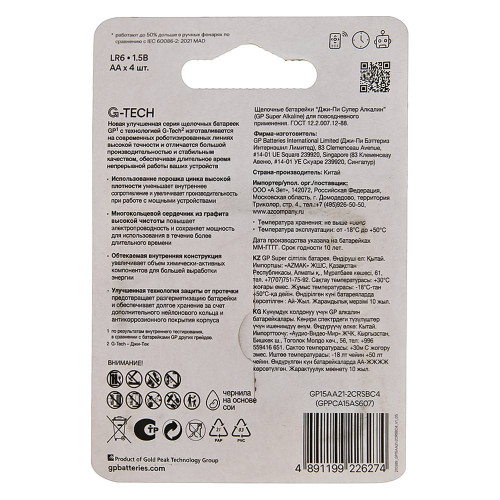 Артикул товара: 3460577 Штрихкод: 4891199226274 Характеристики товара: Вес товара, г - 60.0000. Тип питания - Батарейки. Количество в упаковке, шт - 4. Типоразмер батареек - AA. Габариты упаковки, мм - 15х50х55..