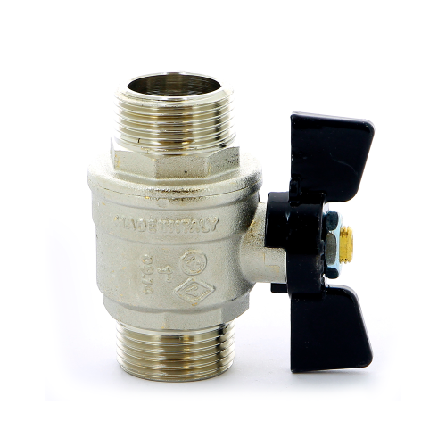Кран шаровой латунный, полнопроходной, резьбы наружная — наружная. Ручка — «бабочка» из алюминия Корпус: латунь CW617N кованная, пескоструенный, никелированный Шар: латунь CW617N кованная, полированный хромированный Резьбы: ISO 228/1 Управление: «бабочка» из алюминия UNI-EN 1706, покрытие — эпоксидная эмаль черного цвета Уплотнения шара: 2 седла из фторопласта- 4/PTFE Шток: латунь CW614N (взрывобезопасное исполнение) Уплотнения штока: 2 из фторопласта-4/PTFE, 1 кольцо из бутадиен-нитрильного каучука/NBR Диапазон температур: от -20°C до +120°C Рабочее давление: от 40 до 64 bar. WOG 600 — WSP 150 Характеристики товара: Тип - кран шаровой муфтовый. Страна производства - Италия. Артикул - 3270032. Размеры - 1..