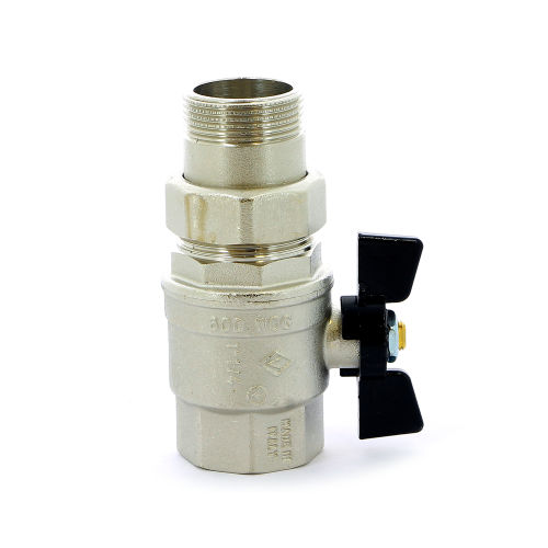 Кран шаровой латунный, полнопроходной, для высокотемпературных магистралей, резьбы внутренняя — наружная (соединитель с накидной гайкой) по ISO 228/1 Ручка — «бабочка из алюминия Корпус: латунь CW617N кованная, пескоструенный, никелированный Шар: латунь CW617N кованная, полированный хромированный Ре... →