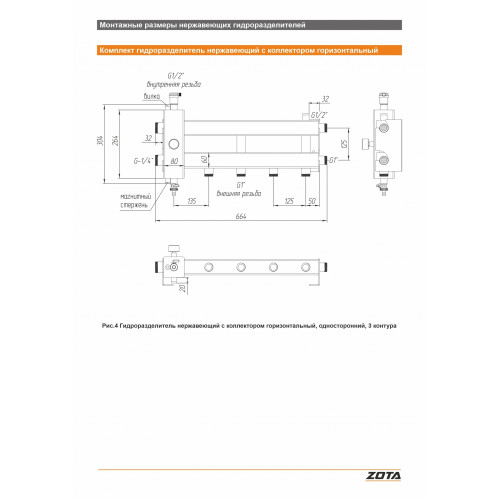 Гидроразделитель нерж. с коллектором горизонтальный, односторонний, 3 контура