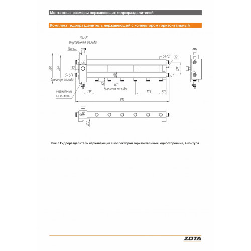 Гидроразделитель нерж. с коллектором горизонтальный, односторонний, 4 контура