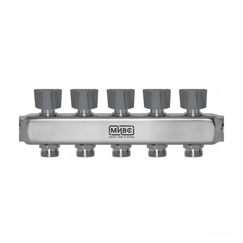 Водоразборный коллектор из нержавеющей стали с кран-буксами вентильного типа, подключение 1”, размер отвода 3/4 E, 6 выходов, WS14
