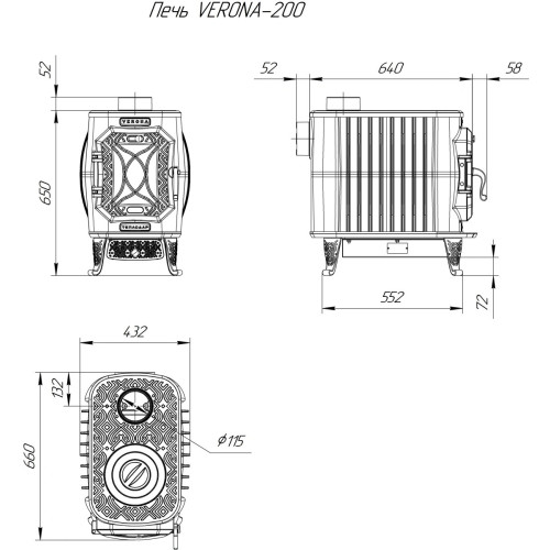 Страна производства: Россия, Модель: Verona-200, Артикул: УТ000015141. Характеристики товара: Назначение - для гаража, для дачи, для дома. Материал - Чугун. Штрихкод - 4640039463719. Дополнительные функции - варочная плита, режим длительного горения. мощность, кВт - 21. способ установки - Напольный. диаметр дымохода, мм - 115. Масса в упаковке, кг, не более - 182. Глубина топки, мм - 540..