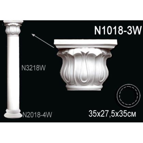 Капитель колонны N1018-3W из полиуретана Перфект Характеристики товара: Материал - из полиуретана. Высота - 27.5. Под покраску - Да. Коллекция - Перфект. Внешний диаметр - 35..