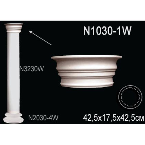 Капитель колонны N1030-1W из полиуретана Перфект Характеристики товара: Материал - из полиуретана. Высота - 42.5. Под покраску - Да. Коллекция - Перфект. Внешний диаметр - 42.5..