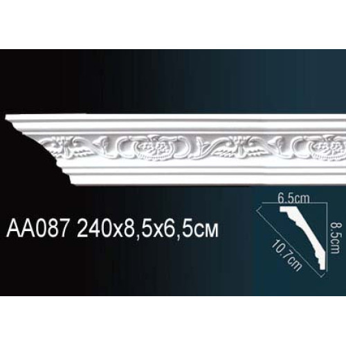 Плинтус на потолок AA087 Перфект Карниз потолочный полиуретановый с рисунком применяется для украшения помещений. Основное назначение этого элемента — декорирование места стыка стены и потолка. Им можно замаскировать неровности отделки и сделать плавный переход между отделочными материалами. Плинтус... →