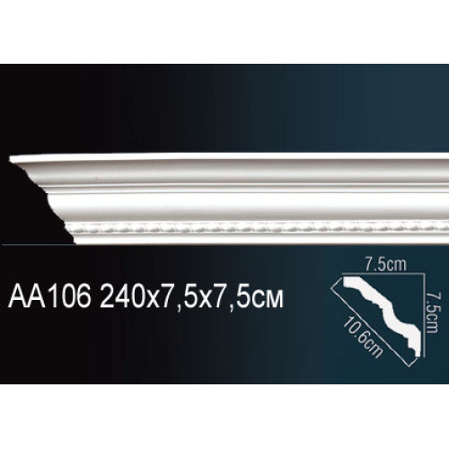 Плинтус на потолок AA106 Перфект Карниз потолочный полиуретановый с рисунком применяется для украшения помещений. Основное назначение этого элемента — декорирование места стыка стены и потолка. Им можно замаскировать неровности отделки и сделать плавный переход между отделочными материалами. Плинтус... →