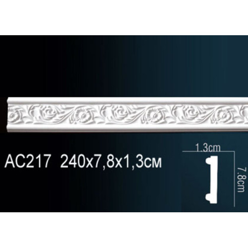 Молдинг полиуретановый с рисунком AC217 Молдинг из полиуретана — это декоративный элемент, используемый при оформлении интерьеров. Планки устойчивы к температурным изменениям, влажности, механическим повреждениям. Рисунок на поверхности модели — изящный орнамент, изюминка в оформлении. Для прочного соединения молдингов рекомендуется использовать специализированный клей из линейки Перфект. Характеристики товара: Материал - из полиуретана. ширина - 8. Толщина (см) - 1.4. Длина (см) - 240. Под покраску - Да. Коллекция - Перфект. Рисунок - Да..