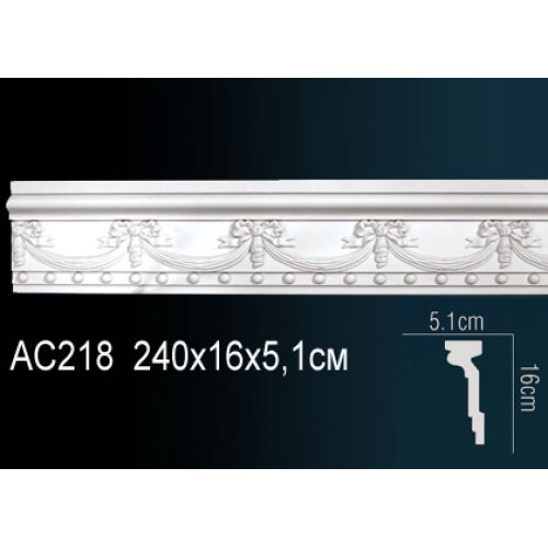 Молдинги для стен AC218 из полиуретана Молдинг из полиуретана — это декоративный элемент, используемый при оформлении интерьеров. Планки устойчивы к температурным изменениям, влажности, механическим повреждениям. Рисунок на поверхности модели — изящный орнамент, изюминка в оформлении. Для прочного соединения молдингов рекомендуется использовать специализированный клей из линейки Перфект. Характеристики товара: Материал - из полиуретана. ширина - 16.4. Толщина (см) - 5.2. Длина (см) - 240. Под покраску - Да. Коллекция - Перфект. Рисунок - Да..