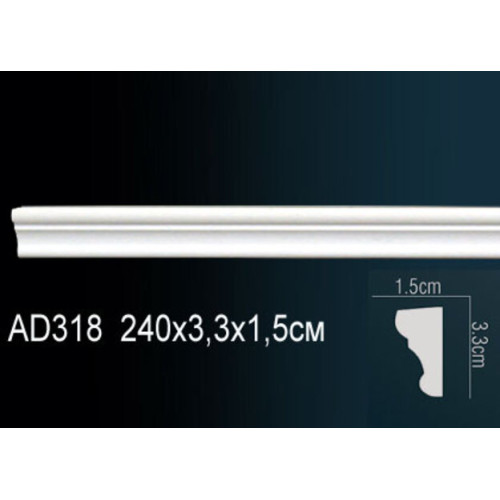 Молдинг из полиуретана AD318 Молдинг из полиуретана — это декоративный элемент, используемый при оформлении интерьеров. Отличается гладкой, ровной поверхностью, которую можно окрашивать. Полиуретановая модель превосходит традиционные деревянные или гипсовые молдинги благодаря высокой влагостойкости, долговечности и устойчивости к насекомым. Они легко монтируются на стены или потолки при помощи специального клея из линейки Перфект. Прекрасно смотрятся как в классических, так и современных интерьерах. Характеристики товара: Материал - из полиуретана. ширина - 3.5. Толщина (см) - 1.7. Длина (см) - 240. Под покраску - Да. Коллекция - Перфект..