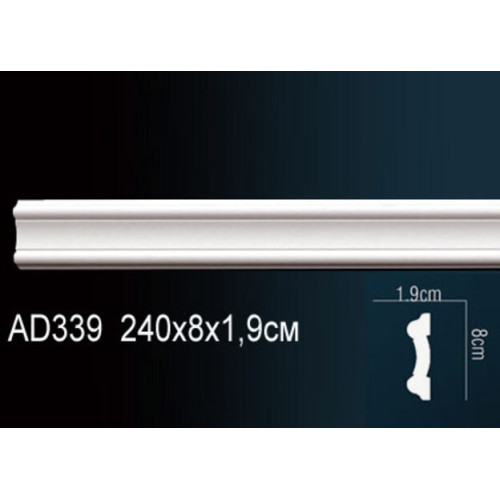 Молдинг из полиуретана AD339 Молдинг из полиуретана — это декоративный элемент, используемый при оформлении интерьеров. Отличается гладкой, ровной поверхностью, которую можно окрашивать. Полиуретановая модель превосходит традиционные деревянные или гипсовые молдинги благодаря высокой влагостойкости, долговечности и устойчивости к насекомым. Они легко монтируются на стены или потолки при помощи специального клея из линейки Перфект. Прекрасно смотрятся как в классических, так и современных интерьерах. Характеристики товара: Материал - из полиуретана. ширина - 8. Толщина (см) - 1.9. Длина (см) - 240. Под покраску - Да. Коллекция - Перфект..