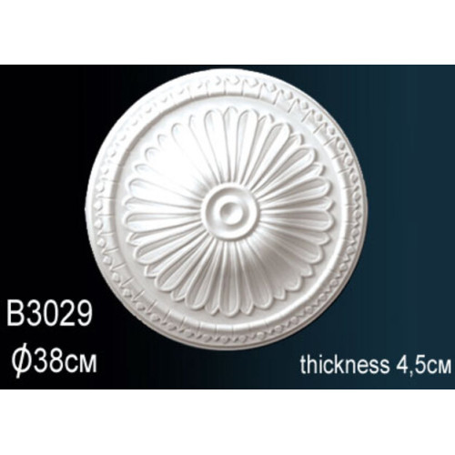 Потолочная розетка под люстру B3029 Перфект Полиуретановая розетка с орнаментом Перфект — элегантное потолочное украшение, придающее интерьеру роскошный вид. Изысканный рисунок сделает выгодный акцент на оригинальном дизайне помещения, интересно подчеркивает люстру или потолочный светильник. Декор для люстры B3029 изготавливается из легкого полиуретана, что упрощает монтаж. Розетка крепится на клей, обеспечивая надежное и долговременное соединение с поверхностью. Модели с красивым барельефом подходят для классических и современных стилей. Изделия можно окрашивать в любые цвета, красками не содержащими растворителей и ацетона. Характеристики товара: Материал - из полиуретана. Толщина (см) - 4.9. Под покраску - Да. Коллекция - Перфект. Диаметр - 37.8..