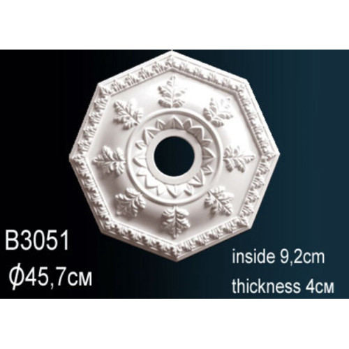 Потолочная розетка под люстру B3051 Перфект Розетка из полиуретана под люстру — декоративный элемент потолка, который часто располагается в центре для обрамления светильника или люстры. Она используется в интерьерах различных стилей для добавления изысканности и завершенности дизайну. Розетки производятся полиуретана. Декоративные конструкции легко крепятся к потолку с помощью специального клея Перфект. Розетки Перфект выбирают для классических и современных интерьеров, помещений с повышенным уровнем влажности. При необходимости модели легко окрашиваются в любой цвет. Характеристики товара: Материал - из полиуретана. ширина - 45.7. Толщина (см) - 4. Длина (см) - 45.7. Под покраску - Да. Коллекция - Перфект. Внутрений диаметр - 9*9..
