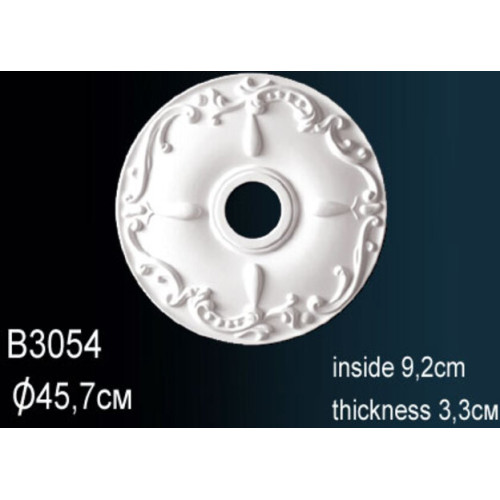 Потолочная розетка под люстру B3054 Перфект Полиуретановая розетка с орнаментом Перфект — элегантное потолочное украшение, придающее интерьеру роскошный вид. Изысканный рисунок сделает выгодный акцент на оригинальном дизайне помещения, интересно подчеркивает люстру или потолочный светильник. Декор для люстры B3054 изготавливается из легкого полиуретана, что упрощает монтаж. Розетка крепится на клей, обеспечивая надежное и долговременное соединение с поверхностью. Модели с красивым барельефом подходят для классических и современных стилей. Изделия можно окрашивать в любые цвета, красками не содержащими растворителей и ацетона. Характеристики товара: Материал - из полиуретана. Толщина (см) - 3.2. Под покраску - Да. Коллекция - Перфект. Диаметр - 45.8. Внутрений диаметр - 9.2..