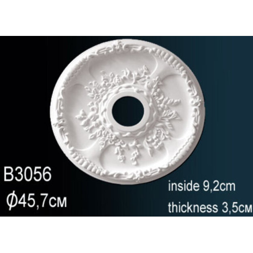 Потолочная розетка под люстру B3056 Перфект Полиуретановая розетка с орнаментом Перфект — элегантное потолочное украшение, придающее интерьеру роскошный вид. Изысканный рисунок сделает выгодный акцент на оригинальном дизайне помещения, интересно подчеркивает люстру или потолочный светильник. Декор для люстры B3056 изготавливается из легкого полиуретана, что упрощает монтаж. Розетка крепится на клей, обеспечивая надежное и долговременное соединение с поверхностью. Модели с красивым барельефом подходят для классических и современных стилей. Изделия можно окрашивать в любые цвета, красками не содержащими растворителей и ацетона. Характеристики товара: Материал - из полиуретана. Толщина (см) - 3.9. Под покраску - Да. Коллекция - Перфект. Диаметр - 45.5. Внутрений диаметр - 9.1..