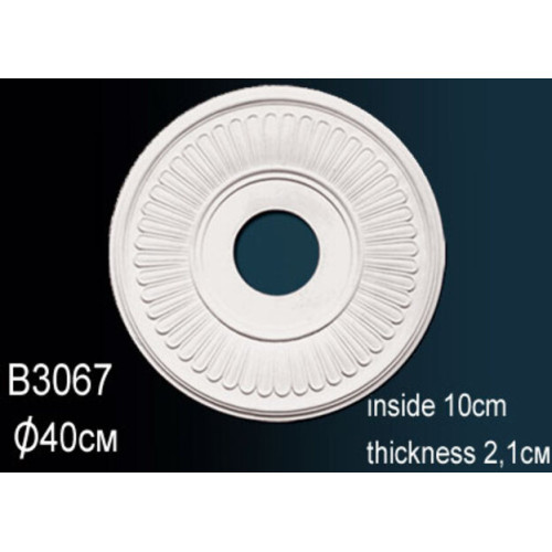 Потолочная розетка под люстру B3067 Перфект Полиуретановая розетка с орнаментом Перфект — элегантное потолочное украшение, придающее интерьеру роскошный вид. Изысканный рисунок сделает выгодный акцент на оригинальном дизайне помещения, интересно подчеркивает люстру или потолочный светильник. Декор для люстры B3067 изготавливается из легкого полиуретана, что упрощает монтаж. Розетка крепится на клей, обеспечивая надежное и долговременное соединение с поверхностью. Модели с красивым барельефом подходят для классических и современных стилей. Изделия можно окрашивать в любые цвета, красками не содержащими растворителей и ацетона. Характеристики товара: Материал - из полиуретана. Толщина (см) - 2.1. Под покраску - Да. Коллекция - Перфект. Диаметр - 40.1. Внутрений диаметр - 10..