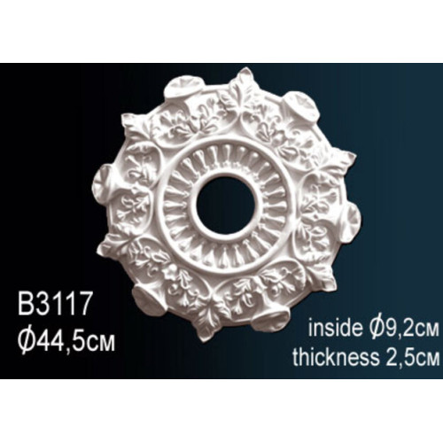 Потолочная розетка под люстру B3117 Перфект Полиуретановая розетка с орнаментом Перфект — элегантное потолочное украшение, придающее интерьеру роскошный вид. Изысканный рисунок сделает выгодный акцент на оригинальном дизайне помещения, интересно подчеркивает люстру или потолочный светильник. Декор для люстры B3117 изготавливается из легкого полиуретана, что упрощает монтаж. Розетка крепится на клей, обеспечивая надежное и долговременное соединение с поверхностью. Модели с красивым барельефом подходят для классических и современных стилей. Изделия можно окрашивать в любые цвета, красками не содержащими растворителей и ацетона. Характеристики товара: Материал - из полиуретана. Толщина (см) - 2.6. Под покраску - Да. Коллекция - Перфект. Диаметр - 44.5. Внутрений диаметр - 9.5..