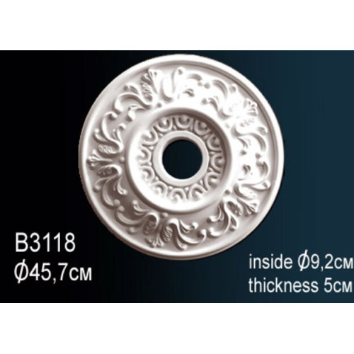 Потолочная розетка под люстру B3118 Перфект Полиуретановая розетка с орнаментом Перфект — элегантное потолочное украшение, придающее интерьеру роскошный вид. Изысканный рисунок сделает выгодный акцент на оригинальном дизайне помещения, интересно подчеркивает люстру или потолочный светильник. Декор для люстры B3118 изготавливается из легкого полиуретана, что упрощает монтаж. Розетка крепится на клей, обеспечивая надежное и долговременное соединение с поверхностью. Модели с красивым барельефом подходят для классических и современных стилей. Изделия можно окрашивать в любые цвета, красками не содержащими растворителей и ацетона. Характеристики товара: Материал - из полиуретана. Толщина (см) - 4.9. Под покраску - Да. Коллекция - Перфект. Диаметр - 45.8. Внутрений диаметр - 9.5..