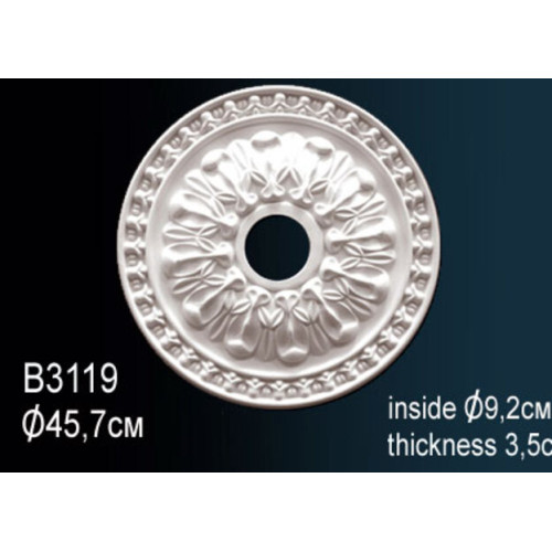 Потолочная розетка под люстру B3119 Перфект Полиуретановая розетка с орнаментом Перфект — элегантное потолочное украшение, придающее интерьеру роскошный вид. Изысканный рисунок сделает выгодный акцент на оригинальном дизайне помещения, интересно подчеркивает люстру или потолочный светильник. Декор для люстры B3119 изготавливается из легкого полиуретана, что упрощает монтаж. Розетка крепится на клей, обеспечивая надежное и долговременное соединение с поверхностью. Модели с красивым барельефом подходят для классических и современных стилей. Изделия можно окрашивать в любые цвета, красками не содержащими растворителей и ацетона. Характеристики товара: Материал - из полиуретана. Толщина (см) - 3.8. Под покраску - Да. Коллекция - Перфект. Диаметр - 45.6. Внутрений диаметр - 9.2..
