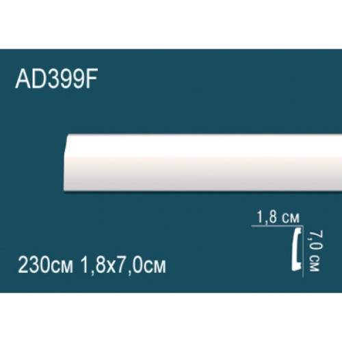 Гибкий плинтус напольный из полиуретана AD399F Перфект Гибкий напольный плинтус — решение для помещений с радиусными стенами, обрамлением основания колонн, полуколонн и ниш. Это не универсальный вариант для всех случаев: его применение оправдано только в ситуациях, где необходима эластичность, так как стоимость гибкого плинтуса выше, чем у жесткого аналога. Для монтажа гибкой планки AD399F используется специальный клей серии «Перфект». Кроме того, плинтус поддается окраске, что позволяет подобрать идеальный оттенок для гармонии с окружающим интерьером. Характеристики товара: Материал - из полиуретана. Высота - 7. Толщина (см) - 1.8. Длина (см) - 230. Под покраску - Да. Коллекция - Перфект..