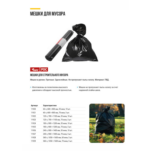 Мешки для строительного мусора, ПВД прочные, 120 л, 700х1100 мм, толщина 70 мкм, 5 шт.