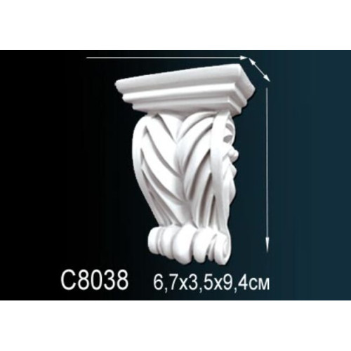 Кронштейн декоративный из полиуретана C8038 Перфект Консоль или кронштейн — стильные и функциональные элемент интерьера. Полимерные декоративные детали, выполненные в классическом стиле с изящным рельефом — роскошь оформления и поддержка для полочек, цветочных горшков или комнатных скульптур. Модели Перфект сочетают в себе легкость и прочность. Декоративные элементы монтируются на поверхности с помощью клея, служат долго, не боятся механических повреждений. Консоли и кронштейны — акцентные детали в дизайне, тонкость и элегантность интерьерной композиции. Характеристики товара: Материал - из полиуретана. Высота - 9.4. ширина - 6.8. Глубина - 3.7. Под покраску - Да. Коллекция - Перфект..