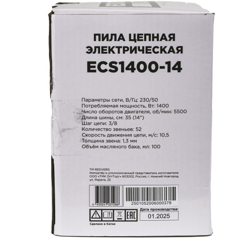 Артикул товара: ECS1400-14 Штрихкод: 4650241031286 Характеристики товара: Тип - Сетевой. Мощность, Вт - 1400.0000. Страна производства - Китай. Вес товара, г - 3000.0000. Ширина паза, мм - 1.3. Количество звеньев цепи, шт - 52.0000. Класс пилы - Бытовая. Инерционный тормоз цепи - Да. Емкость масляного бака, л - 0.1000. Расположение двигателя - Поперечное. Габариты упаковки, мм - 360х210х210..
