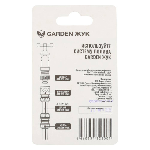 Артикул товара: 323001-00 Штрихкод: 4660254323001 Характеристики товара: Диаметр соединения, дюйм - 1/2. Тип соединения - Цанговое соединение. Диаметр шланга, дюйм - 1/2. Вид фитинга - Муфта. Габариты упаковки, мм - 86х45х43..