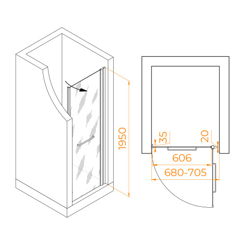 Душевая дверь распашная с маятниковой петлей (открытие только наружу). Маятниковые петли с функцией подъема двери. В комплекте нижняя пороговая планка. Стальная ручка - полотенцедержатель. Трап или поддон приобретается отдельно. Характеристики товара: Душевые перегородки и аксесуары - Да..