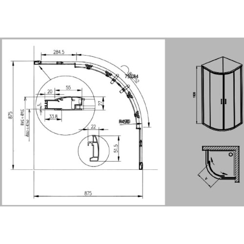 XP2CP4-90 блестящий + транспарент, душевой уголок полукруглый, раздвижной X3B270C00Z1C