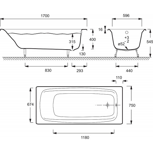 DIAPASON E2937-S-00 Ванна 170 х 75 см без отверстий для ручек БЕЗ АНТИСКОЛЬЗЯЩЕГО ПОКРЫТИЯ E2937-S-00