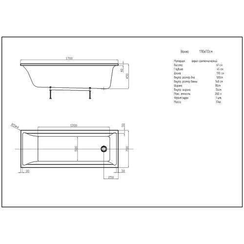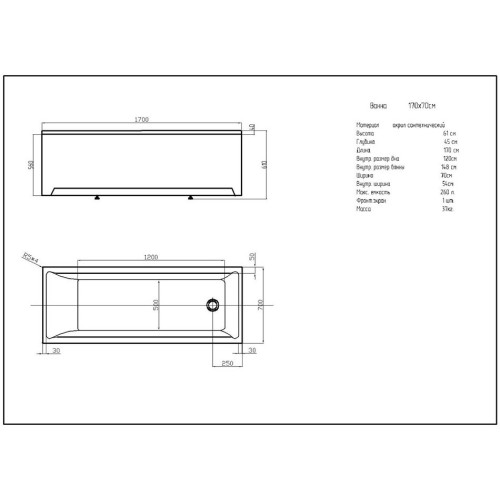 Ванна Лайма прямоугольная 17070 см LAI170-0000001