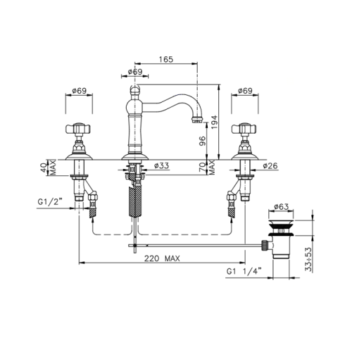 Nicolazzi Dames Anglaises Смеситель для раковины на 3 отверстия, с донным клапаном, излив: 165мм, цвет: хром. 1409CR18