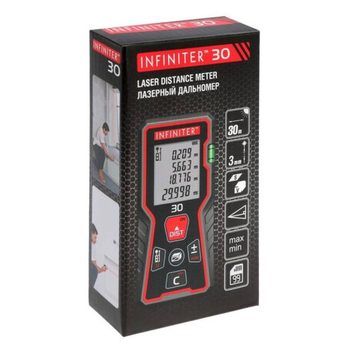 Артикул товара: 1-2-325 Штрихкод: 4620752697295 Характеристики товара: Страна производства - Китай. Вес товара, г - 100.0000. Индикатор уровня заряда - Да. Тип питания - Батарейки. Наличие лазера - Да. Класс лазера - 2. Дальность измерения, м - 30.0000. Цвет лазера - Красный. Габариты упаковки, мм - 40х70х110..