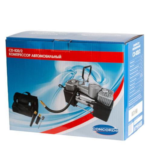 Артикул товара: CD-R20/2 Штрихкод: 4650241017877 Характеристики товара: Страна производства - Китай. Вес товара, г - 1500.0000. Поставляется с - Сумка. Длина кабеля, м - 3.0000. Длина шланга, м - 0.4500. Тип компрессора - Автомобильный. Габариты упаковки, мм - 230х300х170..