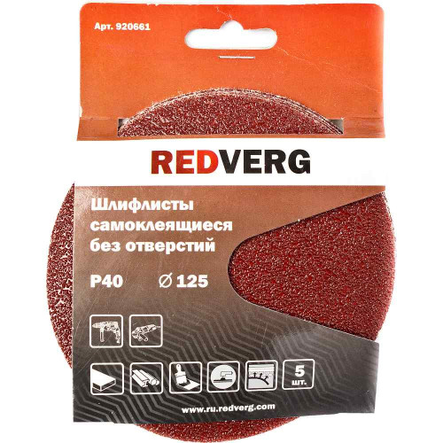 Шлифлист REDVERG самоклеящиеся без отверстий 125мм Р40 (5шт)(920661)