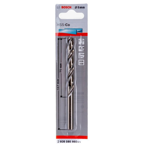 Артикул товара: 2608585860 Штрихкод: 3165140520959 Характеристики товара: Длина, мм - 117.0000. диаметр, мм - 8. Страна производства - КИТАЙ. Вес товара, г - 50.0000. Рабочая длина, мм - 75.0000. Количество в упаковке, шт - 1. Материал обработки - Металл; Нержавеющая сталь; Чугун. Материал - HSS-CO. Диаметр хвостовика, мм - 8. Габариты упаковки, мм - 8х200х40..