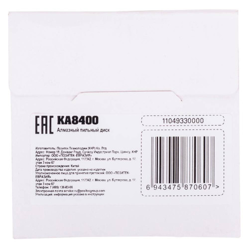 Артикул товара: KA8400 Штрихкод: 6943475870607 Характеристики товара: Страна производства - Китай. Макс. число оборотов холостого хода, об/мин - 13000.0000. Диаметр диска, мм - 110. Диаметр посадочного отверстия, мм - 20. Материал обработки - Керамика. Толщина, мм - 2. Высота сегмента, мм - 7.0000. Габариты упаковки, мм - 20х110х110..