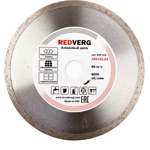 Круг алмазный REDVERG сплошной по керамограниту и плитке 180х22,23/25,4 мм(900111)