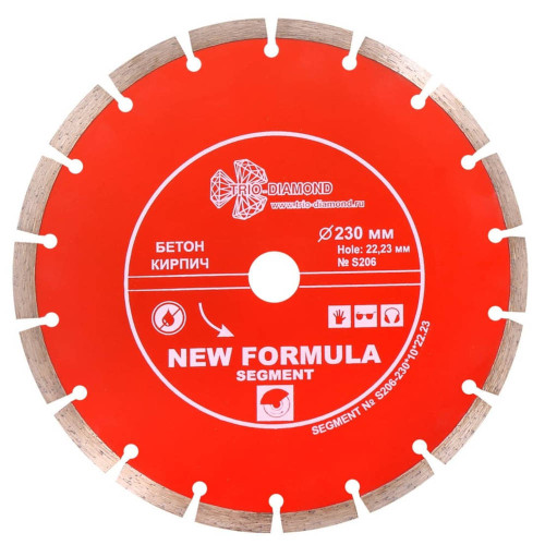 Артикул товара: S206 Штрихкод: 6977779206008 Характеристики товара: Страна производства - Китай. Вес товара, г - 620.0000. Диаметр диска, мм - 230. Диаметр посадочного отверстия, мм - 22.2. Материал обработки - Бетон; Кирпич. Толщина, мм - 2.7. Тип реза - Сухой. Тип алмазного диска - Сегментный. Габариты упаковки, мм - 2х240х280..