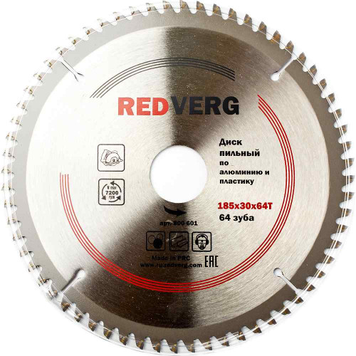 Диск пильный по алюминию и пластику REDVERG твердосплавный 185х30/20/16 мм, 64 зуба(800601)