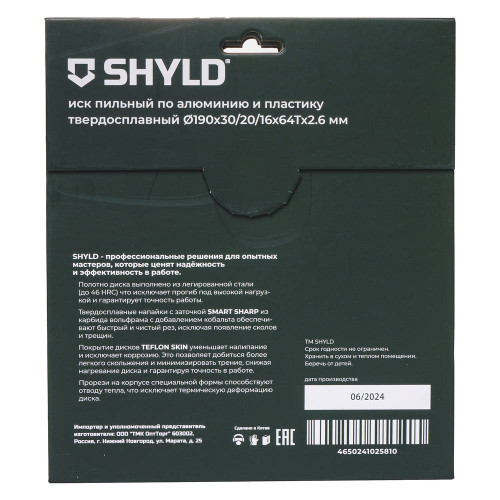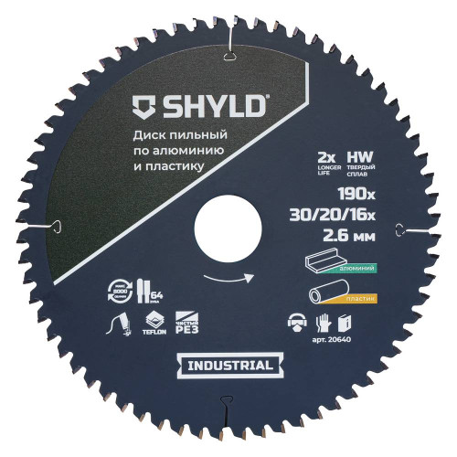 Диск пильный по алюминию и пластику SHYLD твердосплавный 190х30/20/16 мм, 64 зуба(20640)